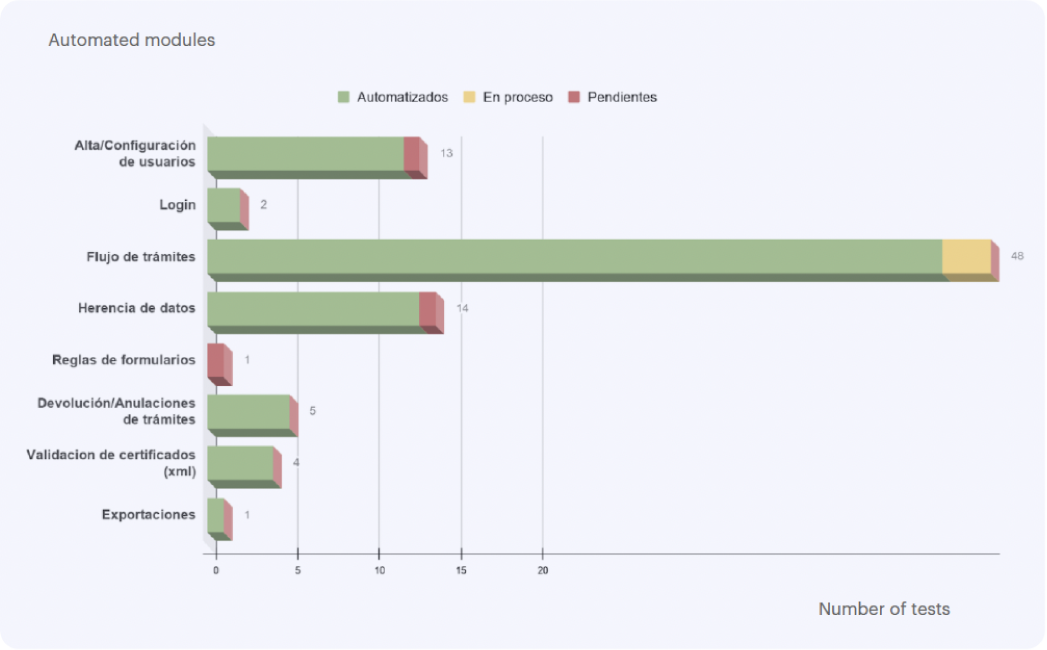 VUCE defined the regression test suite according to high business risk, complex, and/or time-consuming cases. The speed of implementation of the 82 flows was increased by generating GeneXus code obtained with the GXtest Recorder extension. In particular, VUCE flows had an average of 30 screens each, and included multi-user sessions, electronic signatures, and multiple file uploads on the same screen. The following graph shows the 88% of automated flows implemented in 440 hours, flows in progress, and flows pending automation for each system module.