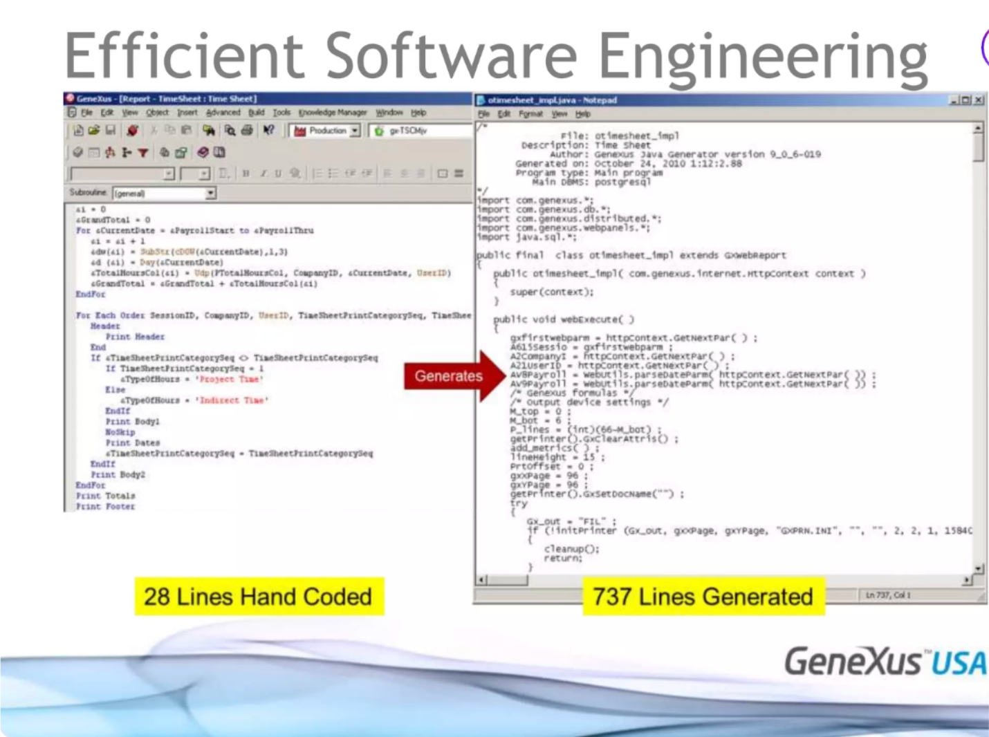 En una conferencia de desarrolladores celebrada en Chicago (Estados Unidos), Reed compartió un ejemplo contundente: 28 líneas de código en GeneXus equivalen a más de 737 líneas en Java nativo. Menos código, más funcionalidad. Un salto cuántico en eficiencia.
