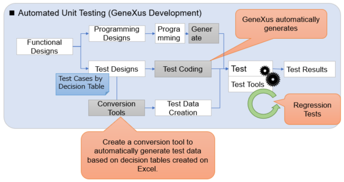 Es difícil aplicar desarrollo ágil a un proyecto de reestructuración del sistema central de un banco, ideando un proceso de desarrollo personalizado que refleje las características del desarrollo con GeneXus basado en waterfall."La automatización de pruebas, incluyendo la implementación de más de 3,000 pruebas unitarias con GXtest, garantizó la calidad del código y nos permitió detectar y corregir errores de manera efectiva a lo largo del ciclo de desarrollo", añade Yokoi.