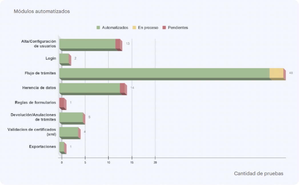 VUCE definió el conjunto de pruebas de regresión por casos de alto riesgo para el negocio, casos complejos y/o que consumían mucho tiempo. La velocidad de implementación de los 82 flujos se facilitó con la generación de código GeneXus obtenida de la extensión GXtest Recorder. En particular, los flujos de VUCE tenían un promedio de 30 pantallas cada uno, incluían sesiones multiusuario, realización de firmas electrónicas y cargas de múltiples archivos en una misma pantalla. La siguiente gráfica muestra el 88% de flujos automatizados en un total de 440 horas, los flujos en proceso y los pendientes de automatizar por cada módulo del sistema.