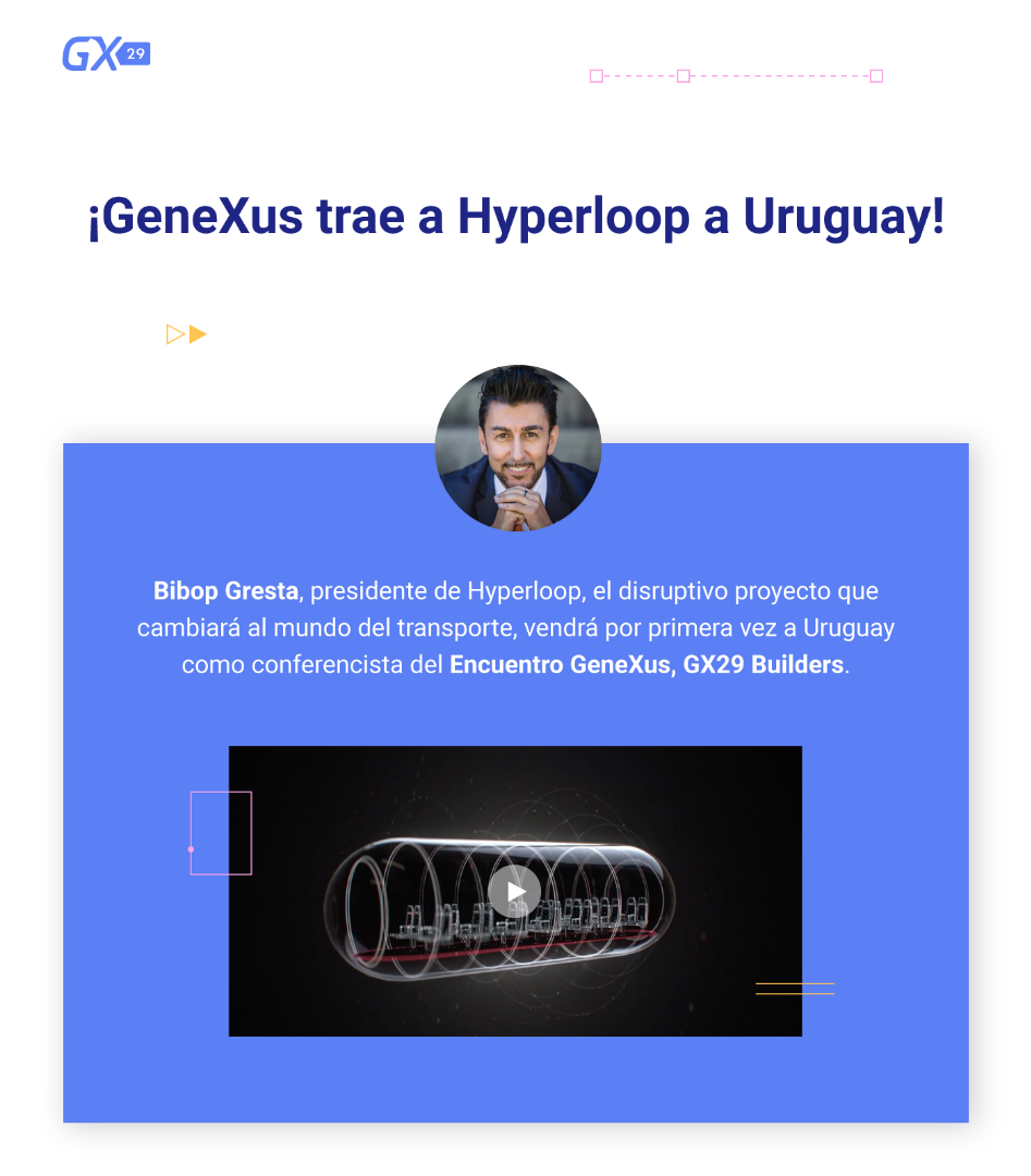 Algunos de sus principales speakers ya han sido anunciados. Entre ellos se destacan: Bibop G. Gresta, co fundador y presidente de Hyperloop TT -el innovador proyecto de transporte aeroespacial-; el influencer tecnológico Eliax; el uruguayo Alejandro Urrutia, fundador de Snapp y ex director de diseño de empresas como DJI y Huawei; Fernando Brum (Agencia Nacional de Investigación e Innovación ANII); Sylvia Chebi (ThalesLab), Daniel Fernández Koprich (Memética Chile), Roberto Icasuriaga y Eduardo Mangarelli (Microsoft LATAM), Alberto Oppenheimer (SAP) y Mayda Kurdian (K2B), así como también referentes de la Comunidad GeneXus como Armin Bachmann y Gastón Milano; entre otros oradores y oradoras que se irán anunciando próximamente.Abrirán y cerrarán los directores de GeneXus, Nicolás Jodal y Breogán Gonda.