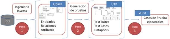 Esta propuesta tiene el objetivo de basarse en estándares tanto como se pueda, para poder así generalizar la idea que inicialmente se aplica en GXtestGenerator para sistemas GeneXus (generando casos de prueba a partir de la KB). Por esto se representa el modelo de datos usando diagramas UML (http://www.uml.org/) extraídos automáticamente a partir del esquema relacional de la base de datos mediante técnicas de ingeniería inversa, para luego generar el modelo de pruebas de forma automática usando transformaciones entre modelos. Dicha transformación busca ocurrencias de patrones que, desde el punto de vista del testing, representan situaciones de prueba interesantes.