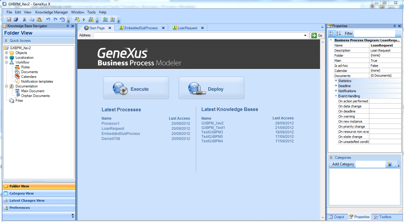 GeneXus Business Process Modeler provee las herramientas para modelar procesos de negocio independientemente de la aplicación que estará asociada a ese modelo. Basado en el estándar de modelado BPMN 2.0 , está orientado a usuarios con perfil analista de negocio.