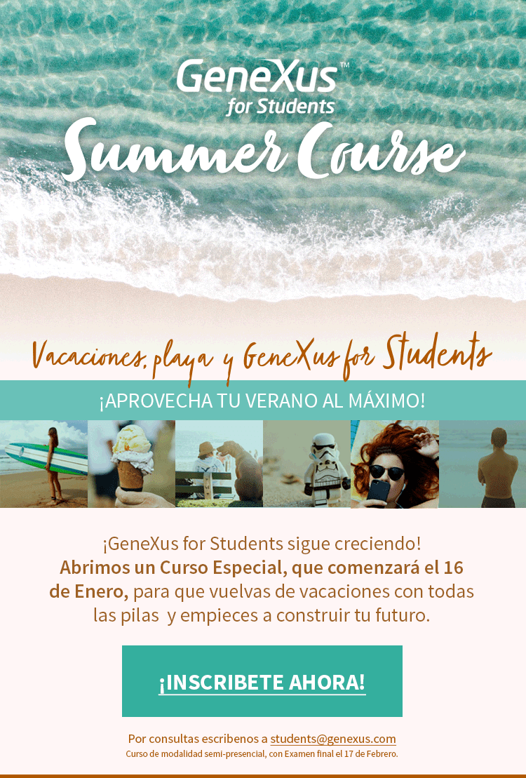 ¡Vacaciones, Playa y GeneXus For Students! GeneXus propone un plan para que jóvenes estudiantes aprovechen al máximo el tiempo libre del verano. Ya están abiertas las inscripciones con cupo para el curso que comienza el próximo 16 de enero.