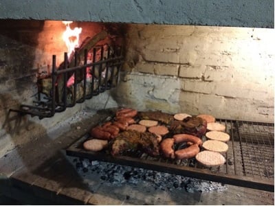 これがウルグアイ式のバーベキューです。先ず、壁側の鉄柵で薪を燃やし、落ちてくる燃えかすと灰を肉の下側に広げ、時間をかけて肉を焼きます。こうすると遠赤外線で肉が軟らかくなり、とても美味しくなります。