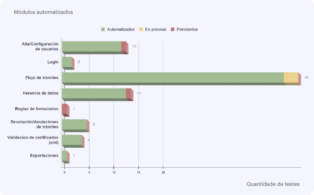A VUCE definiu o conjunto de testes de regressão para casos de alto risco para o negócio, casos complexos e, ou, demorados. A velocidade de implementação dos 82 fluxos foi facilitada com a geração do código GeneXus obtido na extensão GXtest Recorder. Em particular, os fluxos da VUCE tinham em média 30 telas cada, incluindo sessões multiusuário, assinaturas eletrônicas e múltiplos uploads de arquivos na mesma tela. O gráfico a seguir mostra os 88% dos fluxos automatizados em um total de 440 horas, os fluxos em processo e os pendentes de automação para cada módulo do sistema.